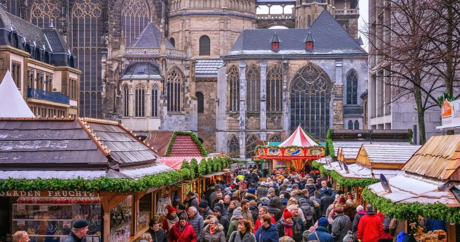 Gezelligheid op de kerstmarkt rond de Dom in Aken.
