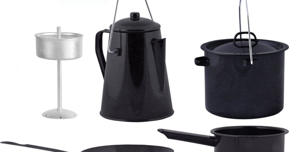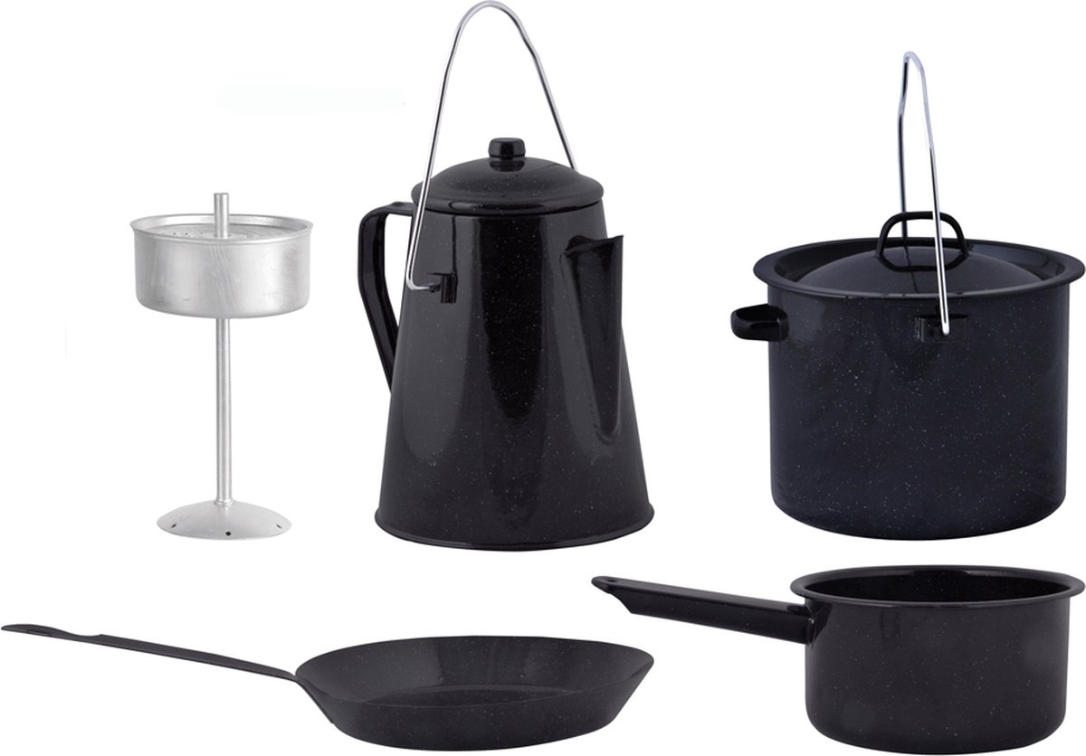 Deze pannenset zal de doorgewinterde kampeerder aanspreken. De pannen zijn namelijk geschikt om boven een kampvuur mee te koken. De vierdelige kookset bevat een koekenpan, steelpan, kookpot met deksel en hengsel, en een koffiepot met een deksel en hengsel. Hij is lichtgewicht en dus ideaal voor onderweg. Bovendien is de set eenvoudig te reinigen. Hier te koop voor 54,99 euro.