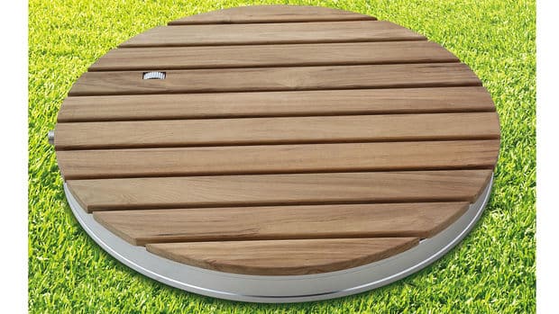 De douche ziet er heel mooi uit. De bodem waar je op staat is van teakhouten planken. Eromheen zit een zilverkleurige aluminium band. Deze buitendouche is er in twee uitvoeringen. Rond met een doorsnee van 70 centimeter en rechthoekig met een oppervlakte van 70 bij 55 centimeter. De plaat heeft een dikte van acht centimeter. Het gewicht van de bodemdouche is acht kilo. De douche is belastbaar tot respectievelijk 120 en 150 kilo. De prijs is vanaf 249 euro.\