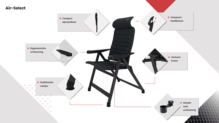 Stoelen die ademen zijn belangrijk op de camping, zeker op warme dagen. De stoffering van de Air-Select-stoelen heeft een open celstructuur die luchtdoorlatend is en waardoor de stof geen vocht vasthoudt. Is de stoel toch nat of vochtig, dan zorgt deze structuur ervoor dat de stof sneller droogt dan bij stoelen met schuimvulling.