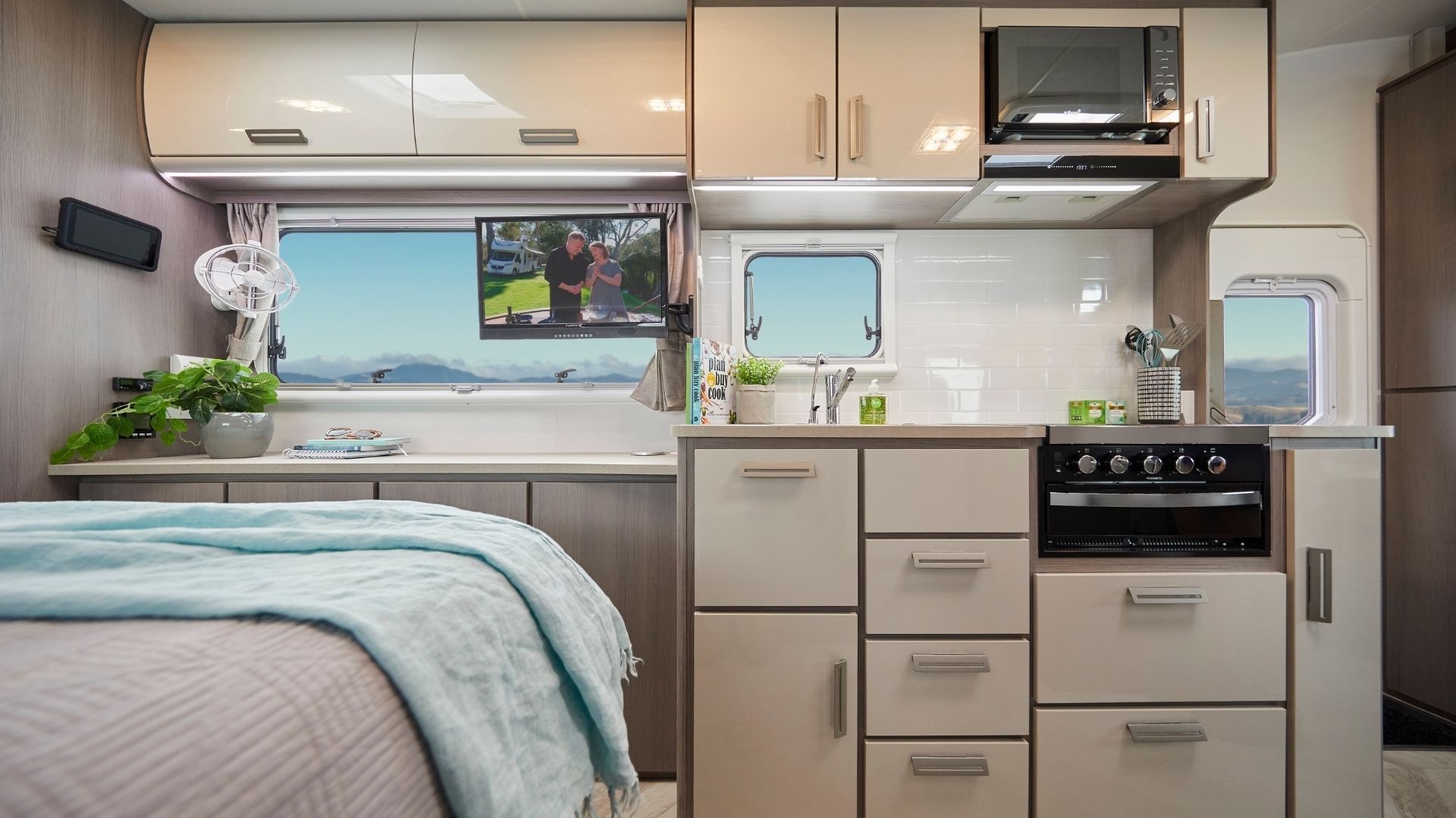 Zo werkt hij op zowel 12 als 24 volt. Je hebt dus geen omvormer nodig. Bovendien is hij draaibaar over 360 graden, dus je kunt de luchtstroom in iedere gewenste richting laten blazen. Wil je dat de ventilator uitgaat als je slaapt? Dat is geen probleem, want je kunt hem zo instellen dat hij na 3, 6, 9 of 12 uur automatisch uitgaat.