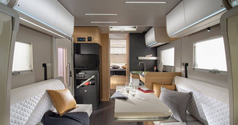 In het interieur zien we in elkaar overlopende vormen. Het keukenblok kreeg een make-over. De koelkast heeft een inhoud van 142 liter. De zithoek is heel modern met de banken tegenover elkaar. Boven de zithoek hangt het hefbed voor extra slaapplaatsen. Dit is groter en lichter geworden. Onder het hefbed nam de stahoogte toe. Achterin heeft de Adria Matrix 670 DL Plus enkele bedden. Hier is gemakkelijk een groot tweepersoonsbed van te maken.