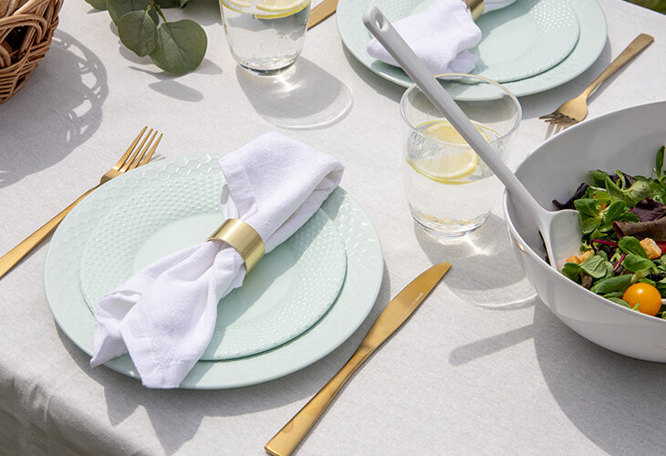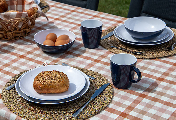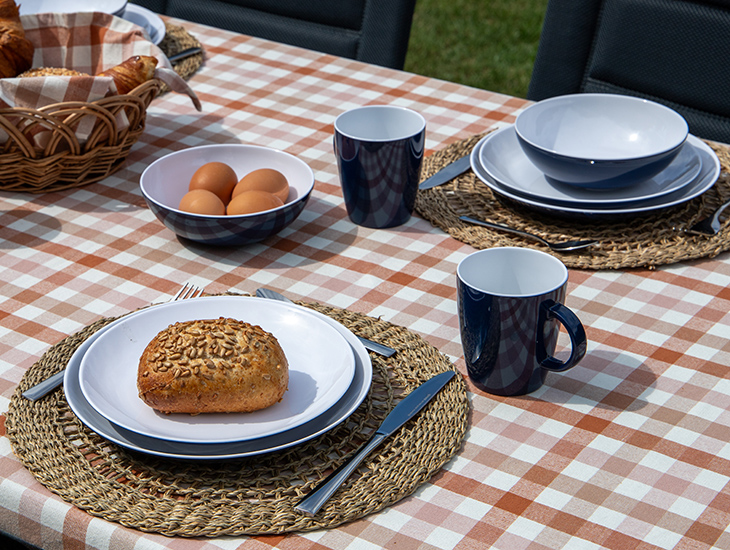 Tot slot heeft Gimex gedacht aan de ietwat onhandige kampeerders bij wie geregeld iets sneuvelt. De producten uit de Solid line zijn namelijk gemaakt van extra dik melamine. Dit geef ze niet alleen een robuuste uitstraling, maar maakt ze ook extra stevig. Het servies is verkrijgbaar in ‘Two-Tone’ (blauw of zwart gecombineerd met wit) of Granite (grijs met beige).