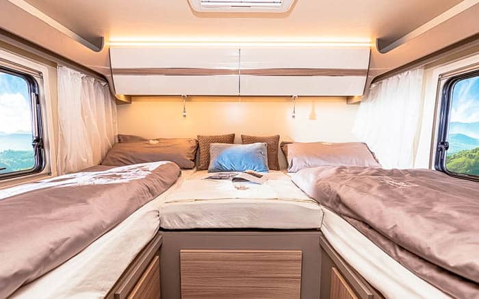 Achterin heeft de Ahorn Camp T 690 twee enkele bedden. De bedmaat is 1,90 bij 0,75 meter. Gemakkelijk bereikbaar door het trapje in het midden. De aanwezige leesspots zijn voorzien van usb-poorten. Dat is erg handig voor onder meer het opladen van je telefoon. Daar is ook een handig aflegvak voor aanwezig. De kleding krijgt een plekje in de twee hoge kasten. Ook onder de bedden en in de trap is opbergruimte te vinden. Onder de bedden een garage met 2350 liter inhoud. De garage is – evenals de garagedeuren aan de zijkant – echter te laag voor gewone fietsen. Naast het optionele en elektrisch te verstellen hefbed kun je ook van de zithoek voorin nog een bed maken. Zo kun je met tot aan vier personen in deze camper slapen. Het hefbed is bedoeld voor één persoon en heeft een bedmaat van 1,95 bij 0,94 meter.