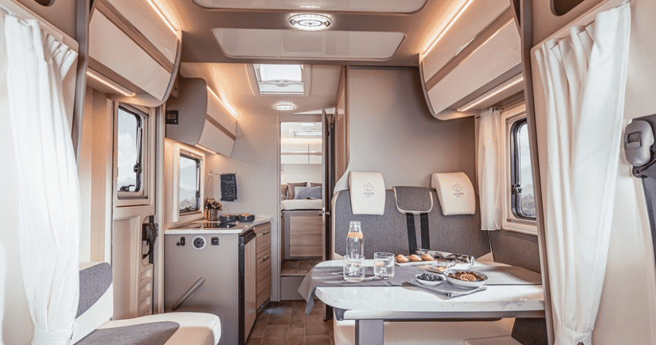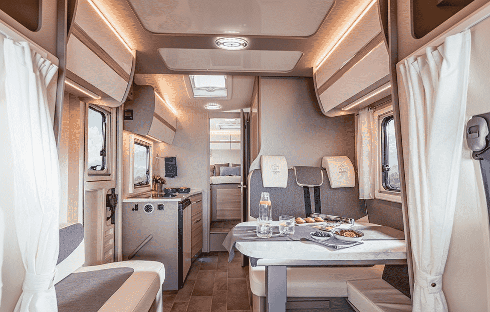 De Ahorn Camp T 690 is hoog. Het voordeel is dat je dat ook terugziet in de stahoogte. Die zit tussen de 1,99 en 2,20 meter. De wat langere camperaar zal dit zeker waarderen. Optioneel hangt er boven de zithoek een hefbed. De opbouw is geheel van gfk. De Camp zit goed in zijn verlichting. Spots en led-strips zorgen in keuken en zithoek voor licht. De deur achter de keuken vormt de afscheiding naar de slaapkamer en de badkamer. De camper lijkt daarmee op een tweekamerwoning. Voorin de zithoek en keuken; achterin de slaapkamer en badkamer. Je hebt het hierdoor voorin snel lekker warm.