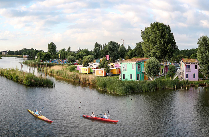 Kwartiertje fietsen van het centrum en om de 5 minuten een tram; dat zegt camping Zeeburg in Amsterdam trots op de eigen website. En wil je naar Amsterdam-Oost of IJburg? Dan ben je daar al binnen 5 minuten fietsen. Toch zie je op Zeeburg lekker in het groen en aan het IJmeer, waar je bijvoorbeeld kan kanoën, kajakken of suppen. De camping heeft een café-restaurant met open haard én spelletjes. Met elk kampeermiddel ben je welkom op camping Zeeburg; van iglotentje tot camper. Je kunt hier zelfs twee plaatsen naast elkaar reserveren, gezellig als je samen op pad gaat. Geen eigen kampeermiddel? Dan heeft Zeeburg van alles te huur; van een barrel tot een eco-cabin of een pipowagen. Allemaal zijn ze even kleurrijk.