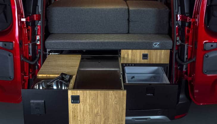 Ga je kamperen dan klap je de bank om en heb je een bed. Vanonder dat bed komt de keuken vandaan. Die trek je aan de achterkant als een la naar buiten. Een gaspitje, een wasbakje met stromend water en een koelboxje. En desgewenst is er onder het bed ook plek voor een porta potti. De schuifdeur kan lekker open blijven staan. De luifel maakt dat je buiten de ruimte hebt. In de schaduw of beschut tegen de regen.