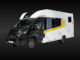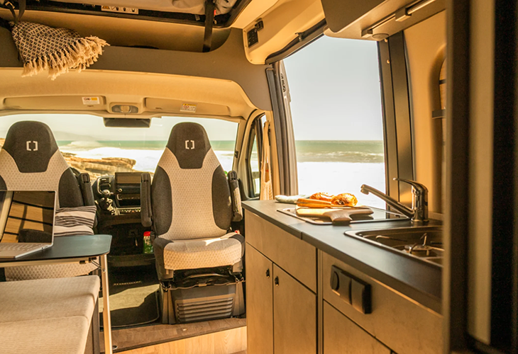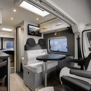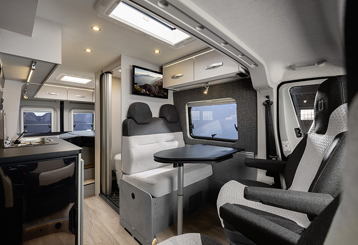 Op de vloer ligt een railsysteem waar de bank op staat en waar net zo makkelijk twee stoelen op passen. De bank is zijwaarts achter de bestuurdersstoel geplaatst. In het midden hangt tegen de wand een tafel, die naar beneden is te klappen. Optioneel is de tafel ook buiten te gebruiken.