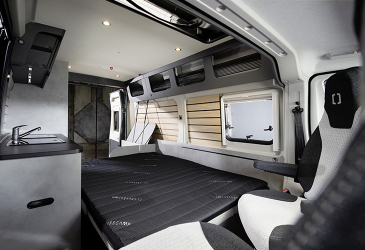 Met zijn 5,41 meter is de Crosscamp Flex 541 de kortste van de drie, waarmee hij prima in het rijtje campers onder de 5,55 meter past. Deze compacte buscamper heeft de toevoeging ‘Flex’ niet voor niets. Hij is namelijk op veertien verschillende manieren in te delen. Daarmee is de camper even geschikt voor een weekendje weg of vakantie als voor een tripje met een flink gezelschap of het vervoeren van grote spullen. De bank transformeert voor de nacht tot tweepersoonsbed én is uitneembaar.