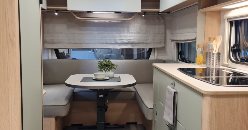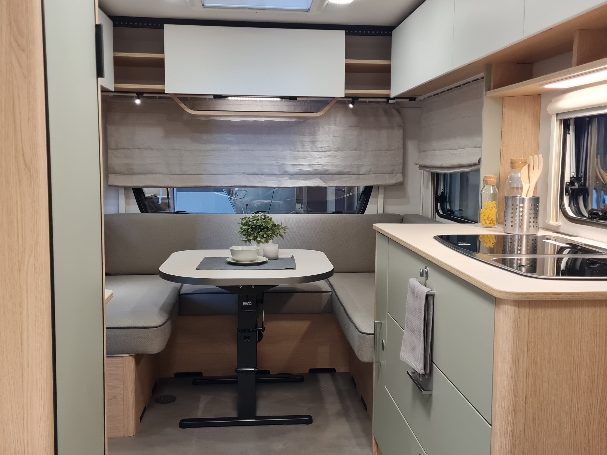 De LMC Style heeft voor 2023 een facelift ondergaan. Opvallend is de groene kleur die in de caravans terugkomt: saliegroen. Op de vloer zien we pvc in betonlook. De bekleding is volledig gemaakt van gerecyclede petflessen: duurzaam en makkelijk schoon te houden. Voor de ramen hangen linnen vouwgordijnen en de nieuwe zwarte rails maken het mogelijk om decoratie aan op te hangen en de caravan op deze manier een persoonlijke touch te geven. Een trend die we steeds vaker zien. In de keuken valt vooral de hoge compressorkoelkast op.