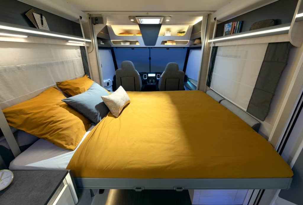 Chausson heeft een traditie als het gaat om aparte indelingen. Dus het is geen verrassing dat ook hun nieuwste integraalcamper afwijkt van de doorsnee exemplaren. Voor de indeling van de Chausson Exaltis 6040 hoefde de Franse camperbouwer – die zijn 40e verjaardag viert – niet eens ver te zoeken. Die is namelijk afgekeken van de eigen populaire halfintegraal: de 640. Die verkoopt goed, dus waarom niet dezelfde indeling in een integraal? En dus heeft de 6040 wél een hefbed boven de zitgroep voorin, maar geen vast bed achterin. Dat hefbed heeft de ruimte, want de zitgroep met langsbanken is ruim opgezet. Het elektrisch verstelbare hefbed – het zakt tot zithoogte – heeft een breedte van 1,60 meter. Er is een ladder beschikbaar, maar die heb je eigenlijk helemaal niet nodig omdat het bed lekker laag zakt.