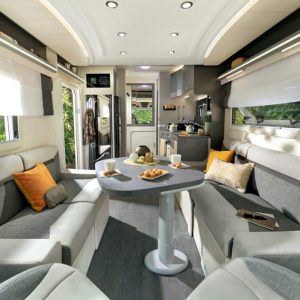 Naast de Chausson Exaltis 6040 met hefbed is er ook een 7068 XLB integraalcamper. Deze is 7,47 meter lang en heeft achterin een queensbed. Mocht je voorkeur uitgaan naar een vast bed, dan is dat de aangewezen indeling.