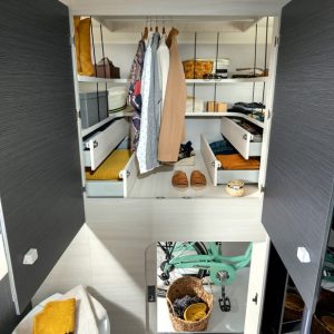 Achter de langsbank aan de bestuurderskant staat het compacte keukenblok. Dat is voorzien van drie pitten en laden met softclose-sluiting. Daar tegenover de ruime – 175 liter inhoud – koelkast. Die staat meteen links naast de deur van het woongedeelte. Achter de keuken – met een kleine opstap – de badkamer. Die strekt zich uit over de volle breedte van de camper en dat is 2,31 meter bij de Chausson Exaltis 6040. Aan de kant van de keuken een ruime douchecabine met houten rooster op de vloer. Aan de andere kant het toilet en de wastafel. Een aansluiting voor een buitendouche is standaard. Achter de badkamer zien we een garage met ruimte voor twee fietsen. De bovenste helft is een grote kast met veel opbergruimte. In deze kast een stang voor kleding en vier grote laden.