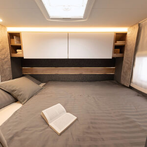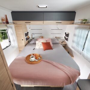 Zoals de naam al doet vermoeden is klauteren er niet bij als je een queensbed in je caravan hebt. Dit vrijstaande tweepersoonsbed kun je vanaf twee zijkanten instappen. Wel neemt dit bed relatief veel ruimte in.