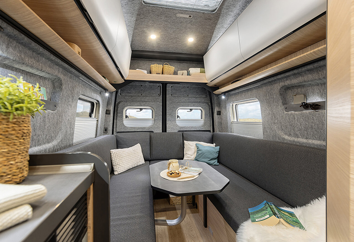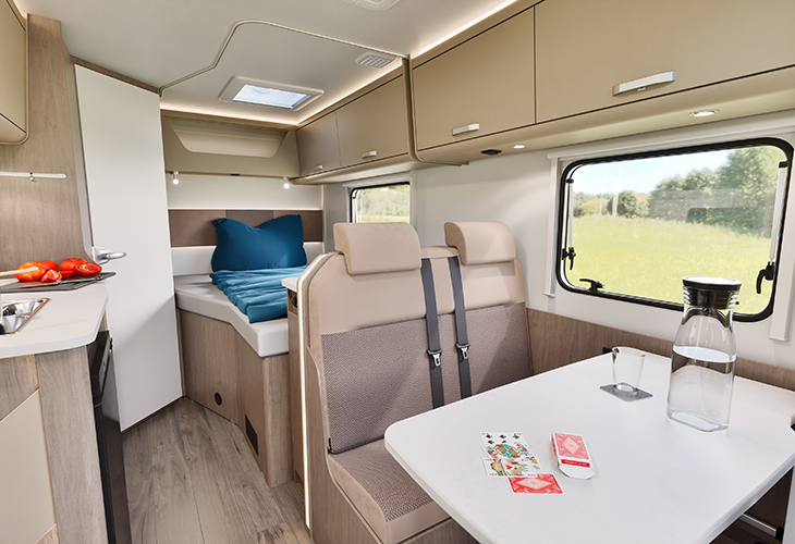 Een groot verschil tussen caravans en campers is de cabine. De stoelen hierin zijn draaibaar, waardoor je ze bij je zitgedeelte trekt. Qua bank zijn er verschillende mogelijkheden, zoals een L-vormige bank of face-to-face-banken. Bij de eerste brengt het bereiken van de achterste zitplaats soms wat geschuif met zich mee. Op banken die tegenover elkaar staan plof je misschien wat makkelijker neer. Bovendien zorgen deze voor een ruimtelijk effect in de camper, omdat je een lange doorkijk hebt. In sommige campers kun je kiezen voor een rondzit achterin. Gezellig, maar als je dit wilt dan kom je vaak – niet altijd – uit bij een grote camper.