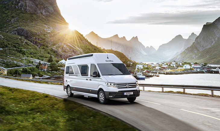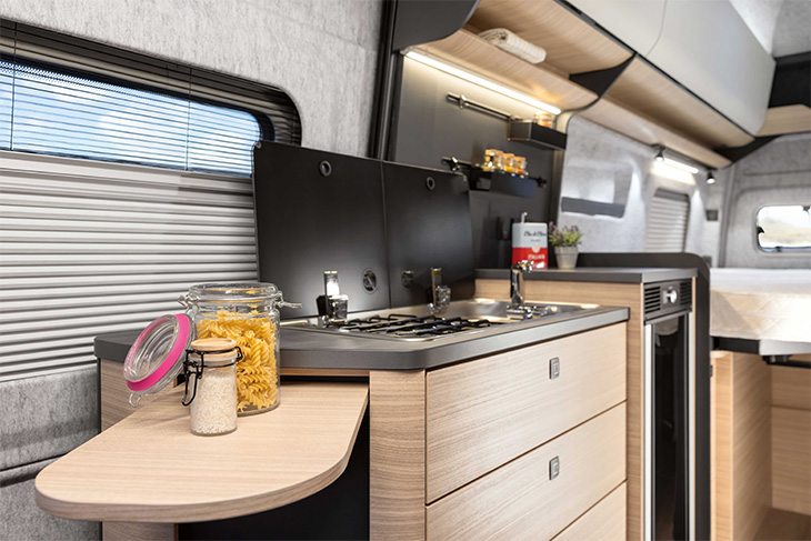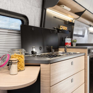 De Hobby Maxia Van heeft een rechte keuken, met een combinatie van een tweepitskookplaat en een gootsteen, beiden met een glazen deksel. Een uitklapbaar blad aan de kopse kant zorgt voor extra werkoppervlak. De keukenlades hebben push-lock-knoppen en een soft-close-sluiting. De Dometic-compressorkoelkast van 90 liter staat rechts van het keukenblok. Op de bovenkant is ruimte om iets neer te zetten.