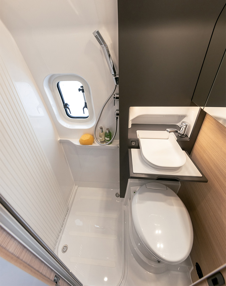 In de compacte badkamer een geïntegreerde douche, een draaibaar toilet van Thetford en een spiegelkast.