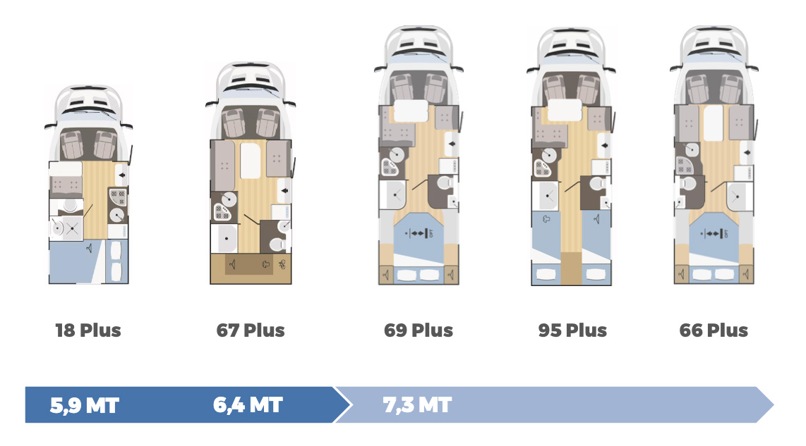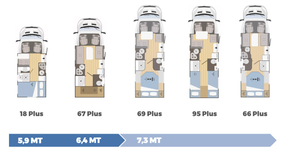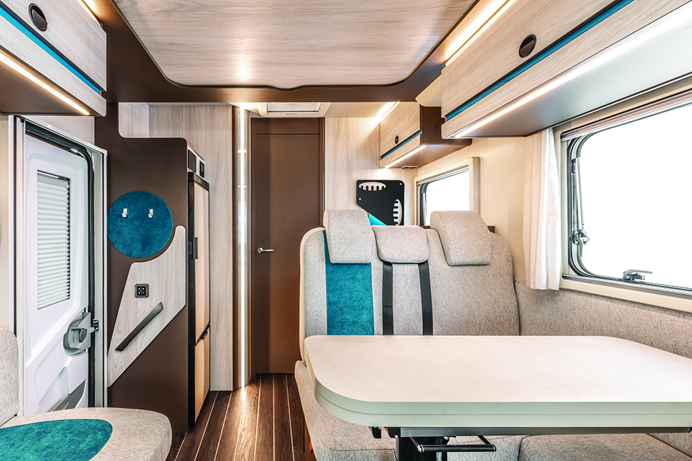 Het interieur van de Kilig-serie kenmerkt zich door de lichte meubelstoffering en kastkleppen in combinatie met warm en donkerbruin. Turquoise accenten maken het geheel af. De campers hebben verschillende badkamers, keukens en garages, zoals je op de plattegronden kunt zien. Allemaal zijn ze voorzien van een 141 liter-koelkast.