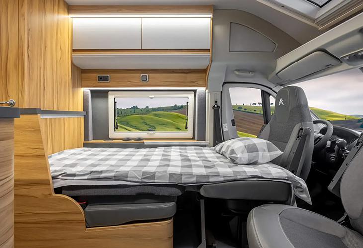 Heel misschien had de Affinity Three beter de toevoeging ’two and a half’ kunnen krijgen. De derde slaapplaats, die ontstaat door de dinettebank om te bouwen, heeft namelijk een afmeting van 0,90 x 1,60 meter en dat is echt voor de meeste volwassenen te klein. De twee andere bedden zijn achterin te vinden en hebben een afmeting van 0,71 x 1,93 meter en 0,74 x 1,81 meter. Door ze samen te voegen ontstaat een tweepersoonsbed.