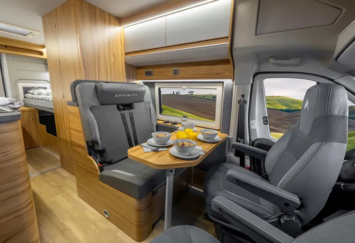 Wie met z’n vieren kampeert en het niet erg vindt om een tentje naast de camper op te zetten, kan ook met z’n vieren in de Affinity Three reizen. De dinettebank en de draaibare cabinestoelen bieden bij elkaar namelijk vier goedgekeurde zitplaatsen.