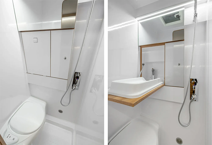 De badkamer, achter de dinettebank, kennen we van andere Affinity’s. Hierin zijn een wastafel, toilet en douche te vinden. De wastafel is handig weg te werken in de wand, waardoor hij geen ruimte inneemt wanneer hij niet in gebruik is.
