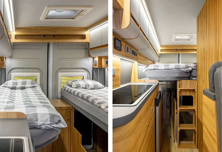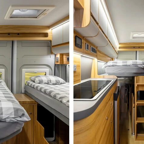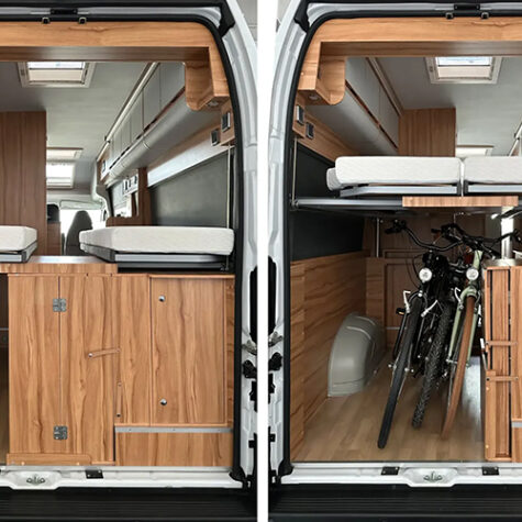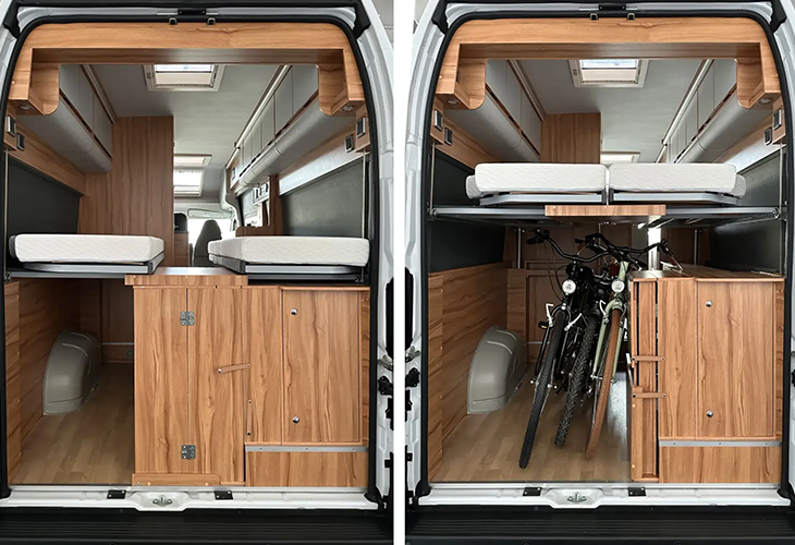 De bedden achterin zijn met een liftsysteem omhoog te zetten. In combinatie met het invouwen van de kledingkast tussen de bedden komt er ruimte vrij voor grote bagage of – zoals op de foto is te zien – twee fietsen. Ook in de hoogste stand is het bed nog bereikbaar, via een trapje.