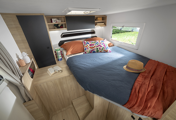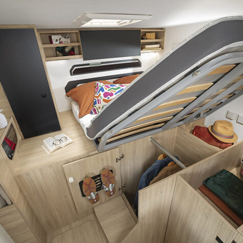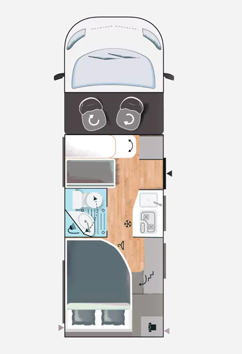 Naast het bed is nog een kast te vinden en dat betekent dat er geen ruimte overblijft voor het sanitair. De vario-badkamer met draaibare wastafelwand en toilet is daarom in het midden van de camper geplaatst, tegenover de keuken.