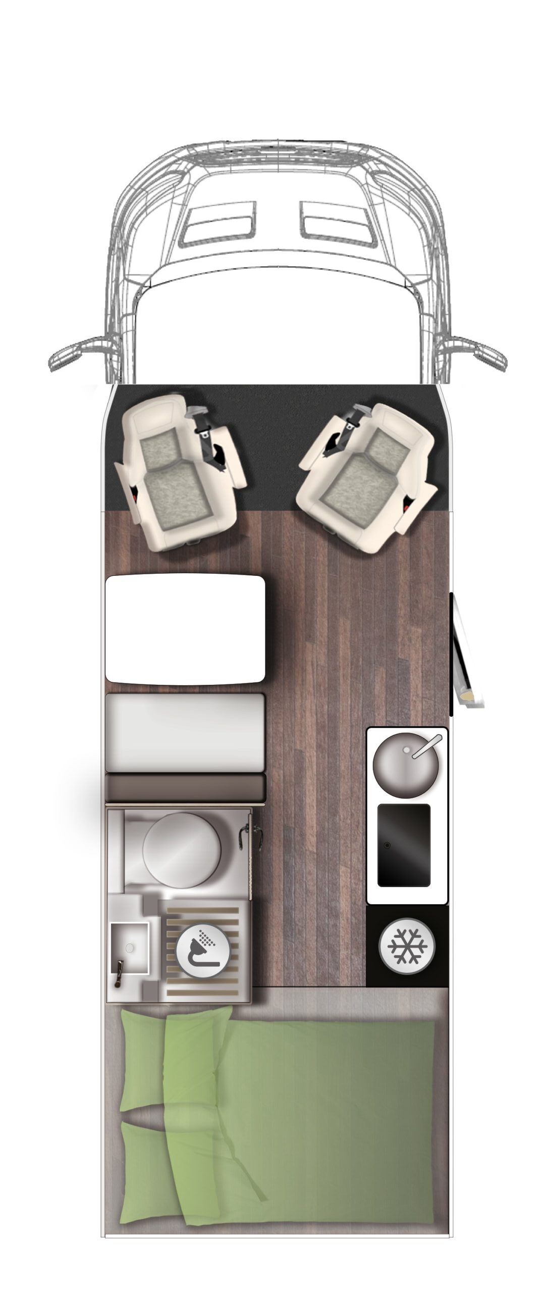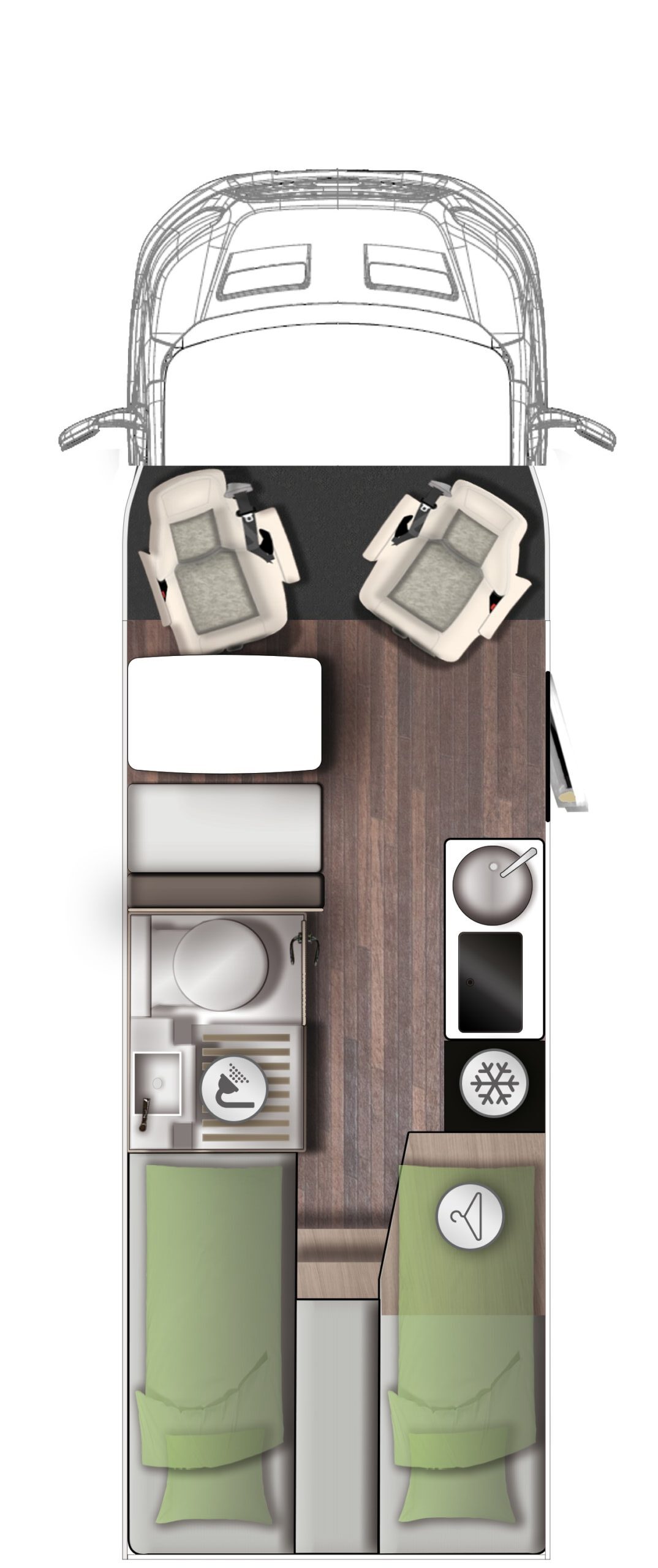 FT 669 EB: 6,69 meter lang, L-vormige zitgroep, enkele bedden (2,01 x 0,78 meter lang) waar ook een tweepersoonsbed van is te maken, rechte keuken, combi-badkamer, garage waar een fiets in past.