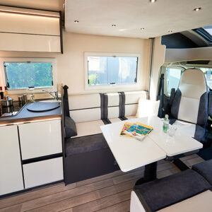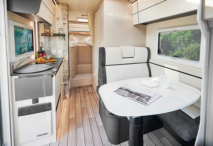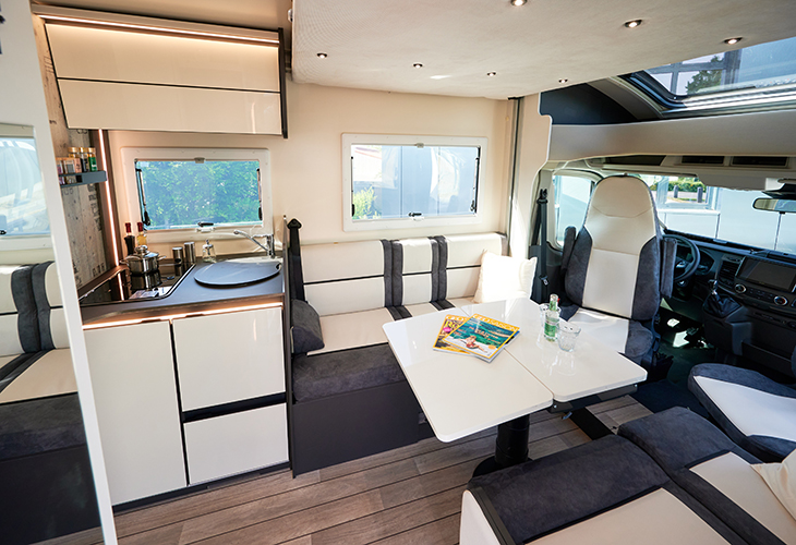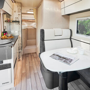 FT 639 LF: 6,39 meter lang, face-to-face-zitgroep met daarboven een elektrisch hefbed (1,90 x 1,42 meter), badkamer over volle achterbreedte mét toegang tot kledingkast plus kleedruimte, hoekkeuken en ruime garage.