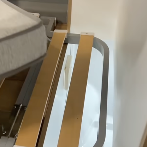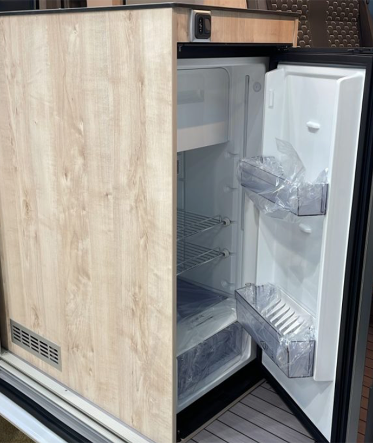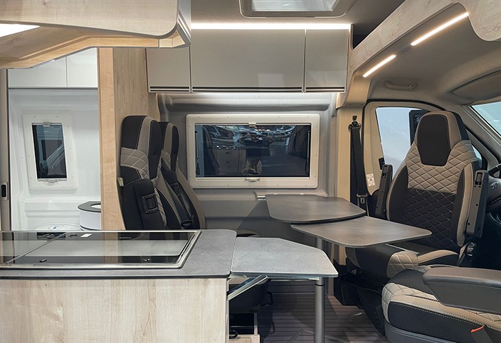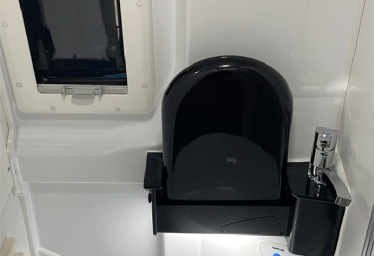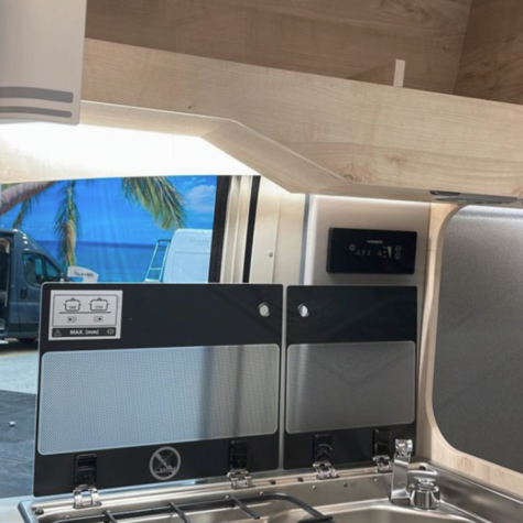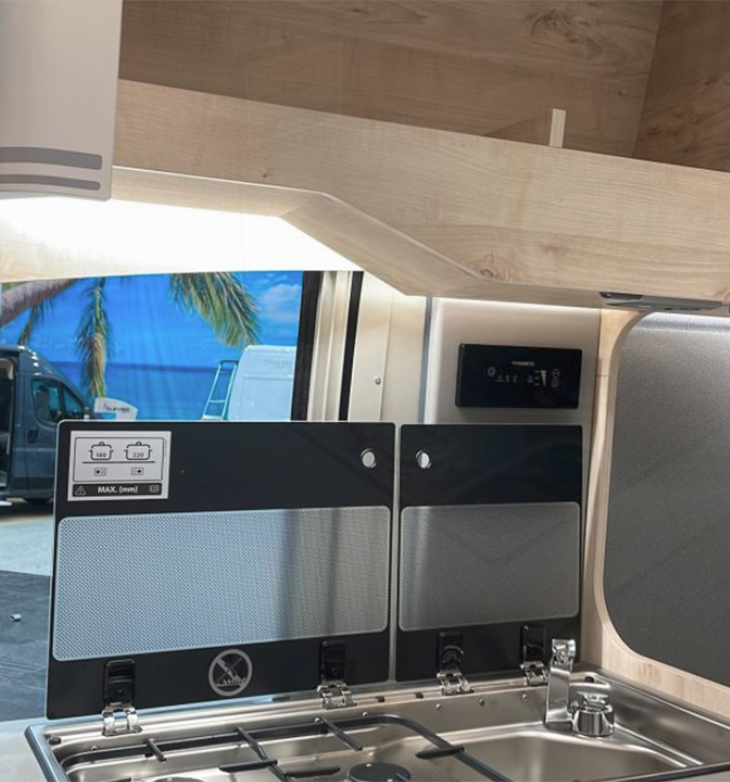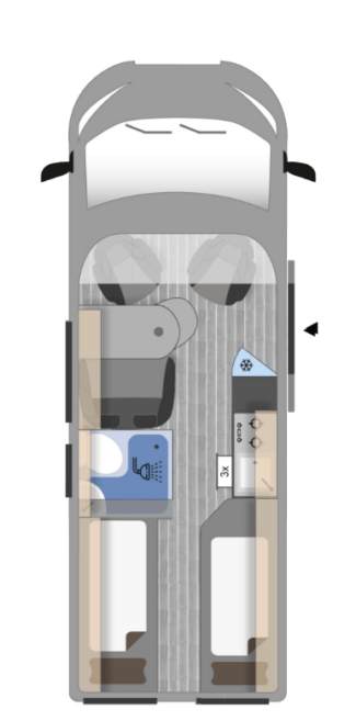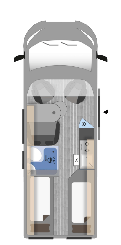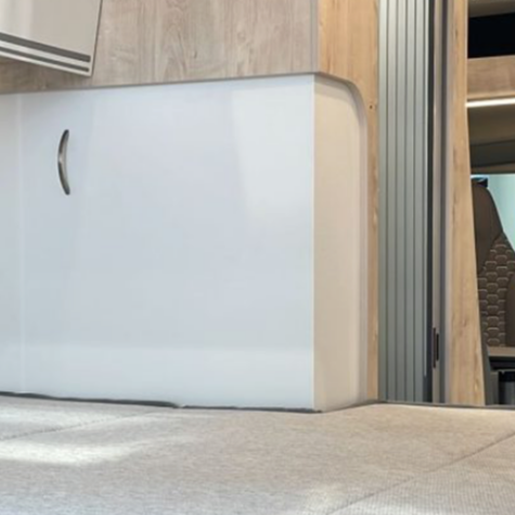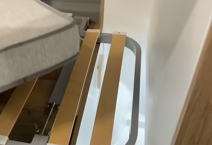 Een campermerk dat een 6 meter lange buscamper met enkele bedden wil presenteren, moet ergens ruimte vandaan halen. De zitgroep kan meestal geen centimeters missen. In de badkamer is daarentegen wél ruimte voor creatieve oplossingen. Om een bedlengte van 1,94 meter te bereiken, is een deel van de badkamerwand uitschuifbaar gemaakt. Bij het voeteneind van het bed aan de bestuurderszijde kan de wand een stuk de badkamer in schuiven, boven de douche. Het laatste deel van de lattenbodem is daarna uit te klappen en past precies in de ruimte die hierdoor is vrijgekomen.
