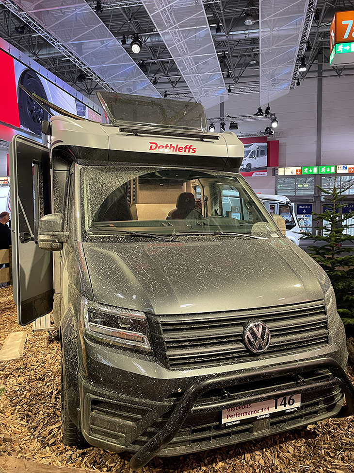 Alsof 'ie net terug is van een uitdagend avontuur in de wildernis: in die staat is de nieuwe Dethleffs Globebus Performance 4x4 te bewonderen op de Caravan Salon. Daarmee trekt deze stoere halfintegraal – de eerste Dethleffs met vierwielaandrijving – flink de aandacht van de beursgangers.