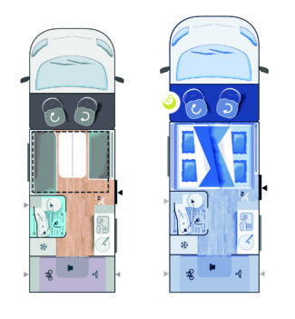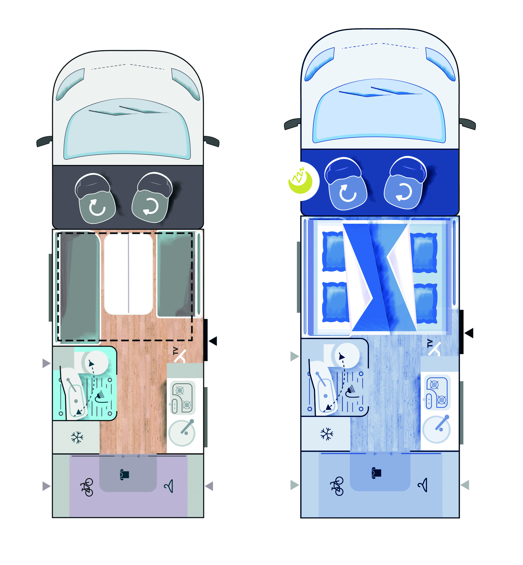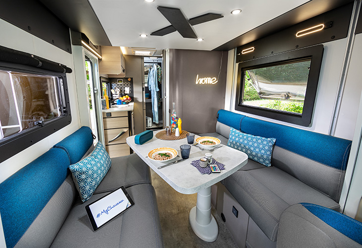 In het zitgedeelte is gekozen voor een face-to-face-indeling. De banken staan tegenover elkaar, wat voor een ruimtelijk gevoel zorgt. Er zijn vier goedgekeurde zitplaatsen, waarvan twee met Isofix.