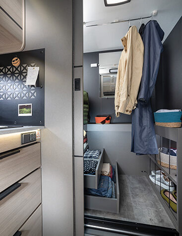 Op de plaats waar je in veel andere campers het bed verwacht, is in de Chausson X650 een multifunctionele laadruimte te vinden. Chausson noemt dit het Smart Dressing Room (SDR)-systeem. Dit is de plek om kleding en schoenen op te bergen. Dat kan in een van de lades en rekken. Het is hier groot genoeg om je om te kleden. Ga je op pad, dan zet je de kleedruimte in de hoogste stand en kun je er twee fietsen in vervoeren.