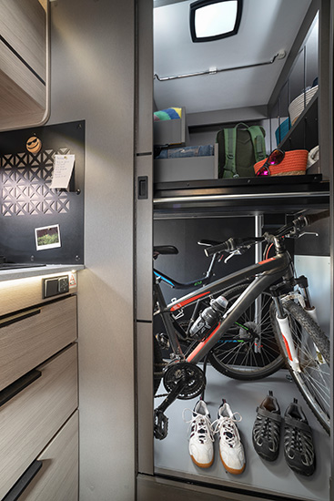 Laat het maar aan Chausson over om met bijzondere indelingen te komen. De Chausson X650 Exclusive Line verschilt op het eerste gezicht misschien niet zoveel van andere campers. De verrassing is dan ook aan de achterzijde te vinden. De flexibele laadruimte is namelijk groot genoeg voor twee fietsen én is net zo snel in een kleedruimte om te toveren.