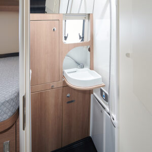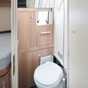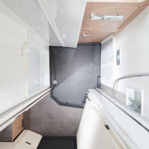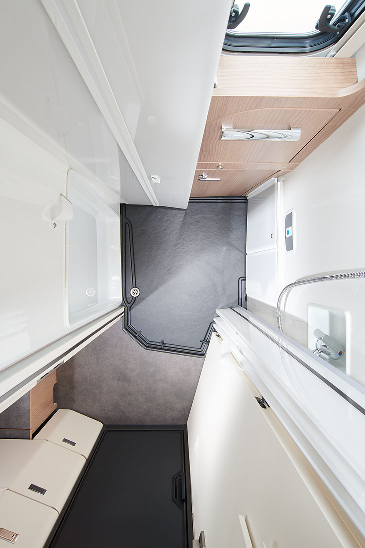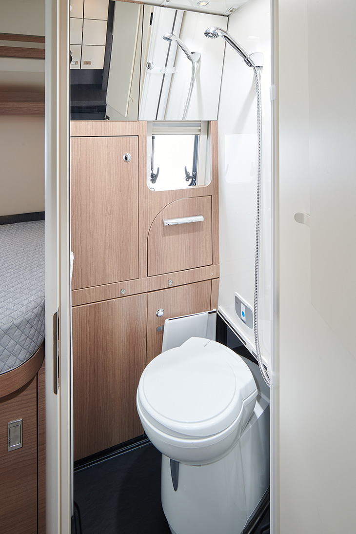 Extra aandacht verdient de badkamer, die van Malibu de naam Supermax heeft gekregen. Deze badkamer is heel compleet, met een grote spiegelkast, een kleinere kast, een wastafel, toilet en douche. Om ruimte te creëren, maakt Malibu gebruik van een opklapbare wastafel en een toilet dat onder dinettebank kan draaien. Als alles is gesloten, ingeklapt en weggedraaid, is de badkamer één grote doucheruimte die zelfs doorloopt tot in het woongedeelte. Een deur zorgt ervoor dat er geen water de camper in loopt. De badkamer is goed te ventileren dankzij het Micro Heki-dakluik.