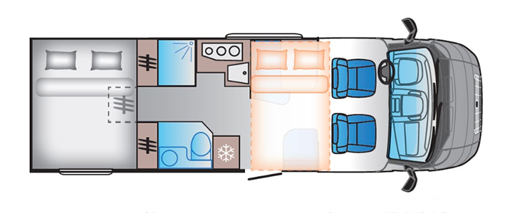 Geen combi-badkamer in de S 72SP, maar een badkamer met wastafel en toilet, en een separate douchecabine. Daarachter het dwarsbed, dat een afmeting van 2,10 x 1,40 meter heeft. Nog twee slaapplaatsen zijn te vinden in het elektrisch hefbed (1,90 x 1,25 meter) dat boven de zitgroep hangt.