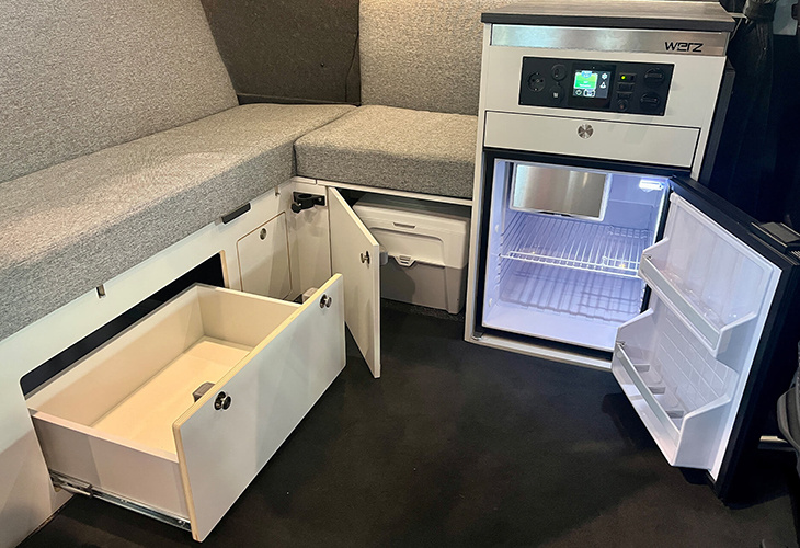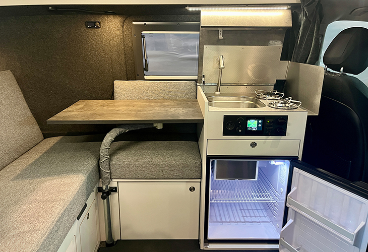Het keukenblok is compact, maar biedt alles wat een kampeerder nodig heeft. Dat is onder meer een compressorkoelkast met een inhoud van 62 liter. Daarboven een vierkante spoelbak en twee gaspitten.