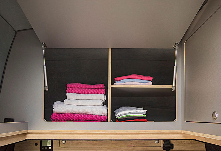 De hoekbank met twee gordelplaatsen biedt veel zitruimte. Het tafeltje dat erbij hoort, is op verschillende manieren te installeren. Onder de bank bevinden zich lades met behoorlijk wat opbergruimte.