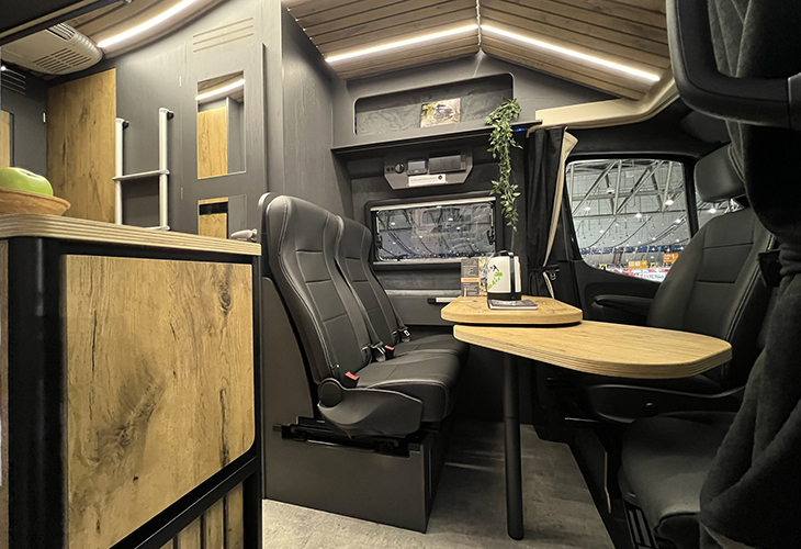 Vier personen kunnen reizen en slapen in de Wiemobil 720 4×4 Performance. De dinettebank biedt plaats aan twee personen en de cabinestoelen zijn draaibaar. Boven de zitgroep hangt een hefbed voor twee personen. Ook achterin is nog een hefbed (1,90 x 1,50 meter) te vinden.