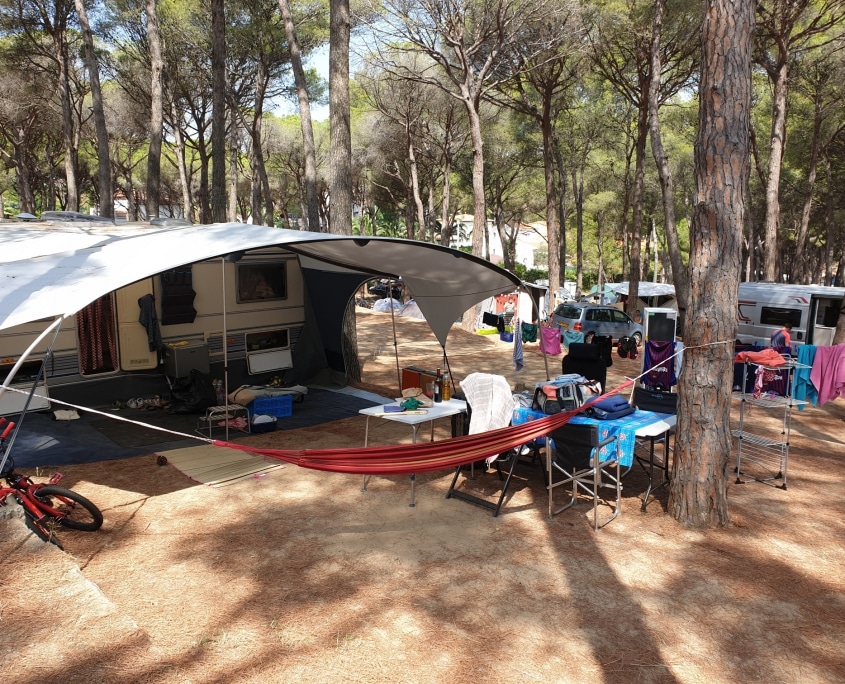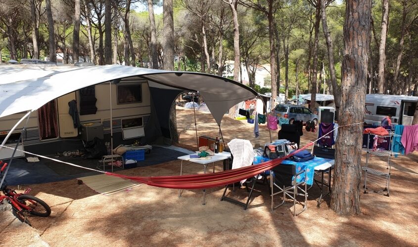 We zijn ruime Franse plekken gewend, dus het was even slikken toen we het lange, smalle én schuine plaatsje zagen dat ons was toegewezen. Het kostte bloed, zweet en tranen om ons reispaleis er te parkeren. Gelukkig hadden we uiteindelijk zelfs nog plek voor de hangmat!