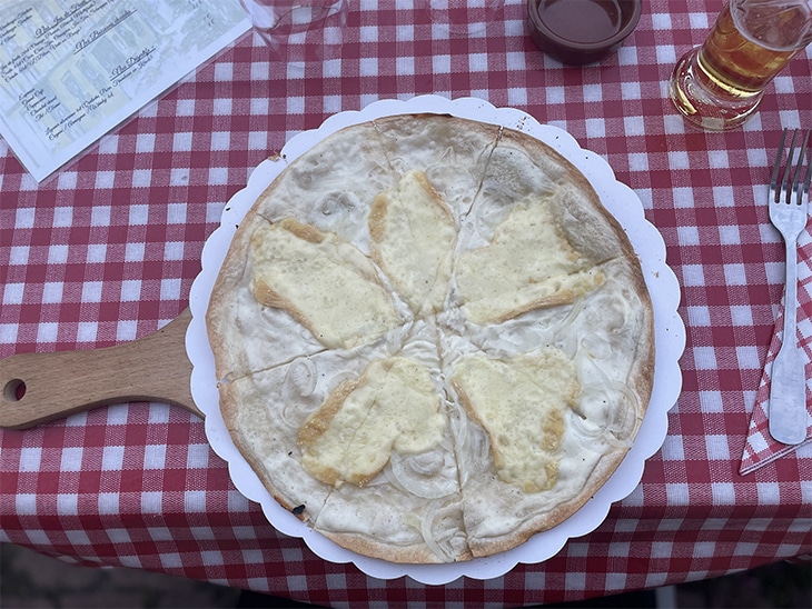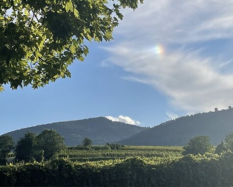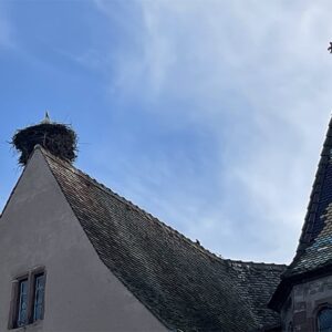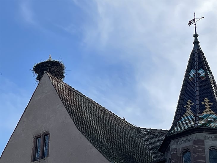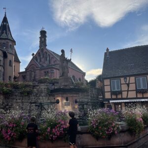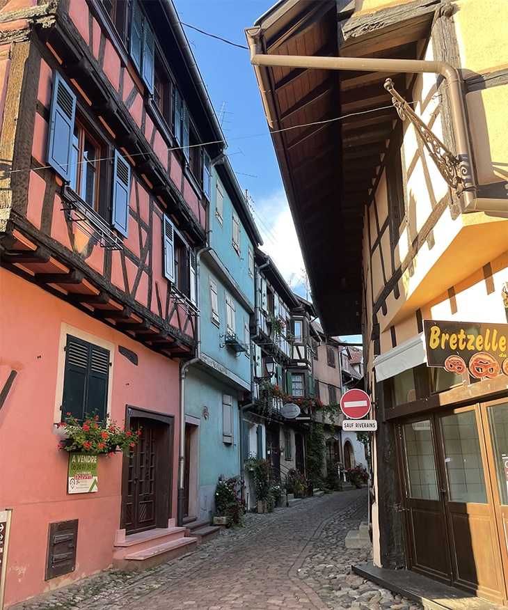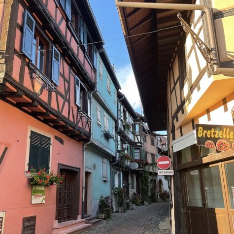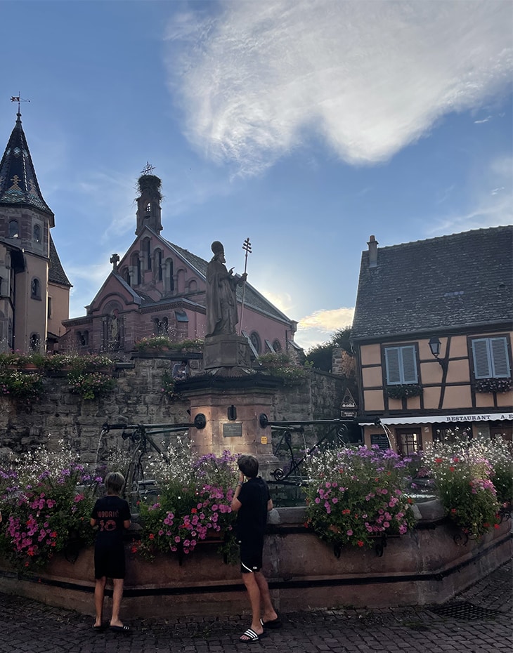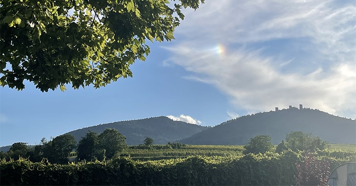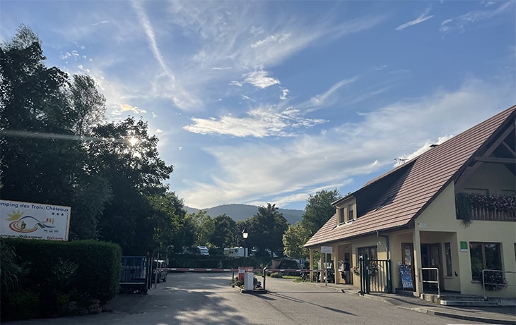 Lang hoefden we niet te zoeken naar een overnachtingscamping in Frankrijk. Ons oog viel al snel op Camping Les Trois Châteaux in Eguisheim. We zagen foto’s van het dorpje met z’n gekleurde huizen en waren meteen verkocht. Gelukkig bleek de camping zelf ook erg fijn. Basic, maar voor een kort verblijf vonden wij het echt prima. Het begint al wanneer je vanaf de snelweg richting de camping rijdt. Langs velden vol wijnranken met opeens, hoog boven op een heuvel, drie kastelen. Juist, Les Trois Châteaux. Op de camping zelf werd het alleen maar beter toen we mochten kiezen uit een paar voor ons gereserveerde plaatsen en één daarvan recht op de kastelen uitkeek. Die namen we natuurlijk, needless to say.
