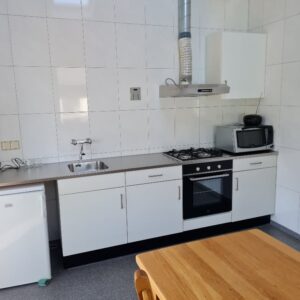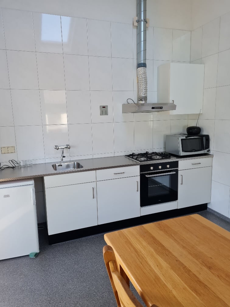 Wie niet wil koken op een kampeertoestelletje kan terecht in de gemeenschappelijke keuken. Ik heb er een kijkje genomen en ook deze was weer hartstikke schoon. In de keuken staat niet alleen een gasstel, maar ook een magnetron en een koelkast, pannen, borden en bestek. Campinggasten kunnen hier gratis gebruik van maken. Na het koken kun je de maaltijd meenemen naar je kampeerplek, maar je kunt ook aan een van de picknicktafels op de overdekte veranda gaan zitten.