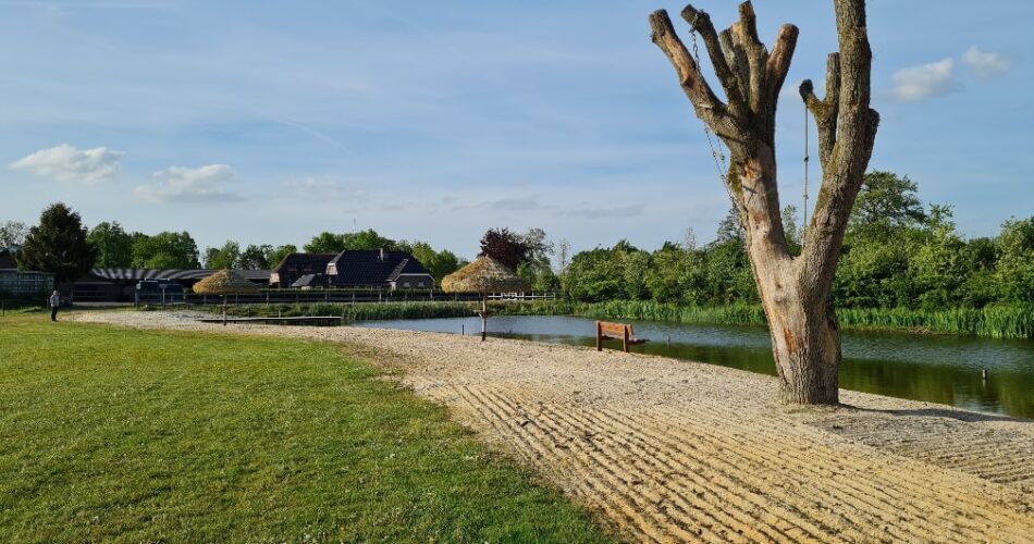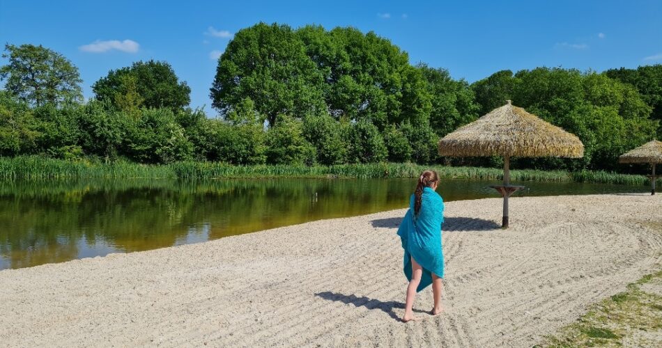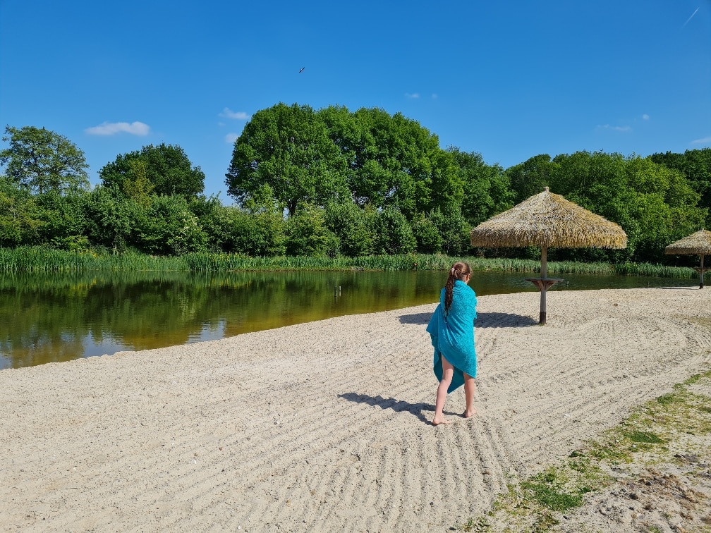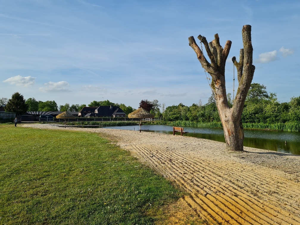 We hadden dus een duidelijk doel voor ogen toen we naar de camping vertrokken, namelijk de nieuwe voortent uittesten. Maar omdat we met de kinderen (10 en 12 jaar) gingen en het een zonnig weekend was, was het fijn dat De Mussenkamp meer te bieden heeft dan alleen een ruime plek. Een zwemvijver bijvoorbeeld. Deze is leuk aangelegd, met een klein strandje, een klimboom en een steiger. Mijn dochter twijfelde even toen ze er futen met jonkies rond zag zwemmen (“Denk je dat hier nog meer beesten zitten?”), maar uiteindelijk nam ze een plons. Haar broer had toen al lang en breed een bommetje vanaf de steiger gemaakt. Ze vonden het water nog wat fris en hielden het snel voor gezien, maar ik kan me voorstellen dat er in de zomer heel wat kindjes in rond spartelen.