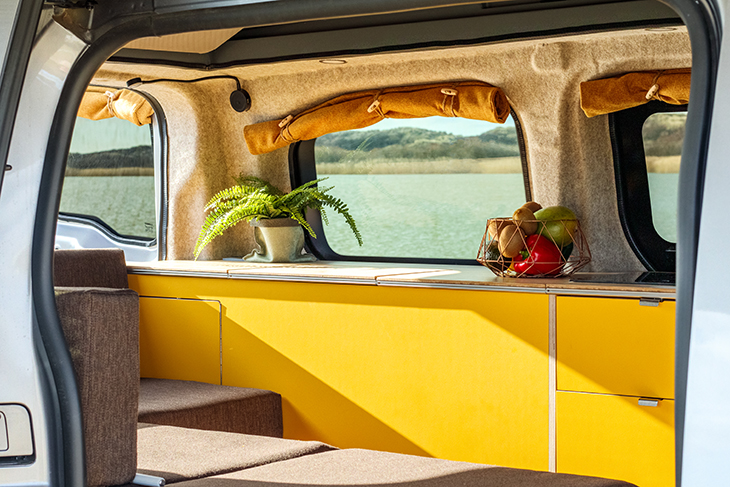 In grote lijnen is de nieuweling vergelijkbaar met de ombouw voor de Transporter. Het grote verschil is dat het nieuwe model de mogelijkheid tot elektrisch koken biedt. Verder is de Campr e-Drifter uitgerust met een keukenmeubel met 45 liter-compressorkoelkast, een spoelbak en kastruimte. Van de bank is een bed te maken. Een multifunctionele tafel behoort ook tot de standaardinrichting. De ombouw is helemaal naar eigen wens samen te stellen. Zo is er keuze uit de frontkleuren van de kastjes en uit verschillende grepen. Optioneel biedt Campr nog een lijst aan extra’s, waaronder een buitenkeuken, extra ramen, een luifel en wandpanelen van bijvoorbeeld kurk.