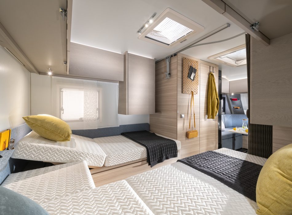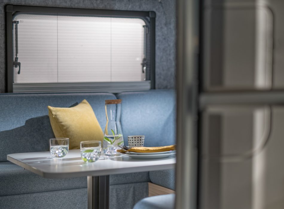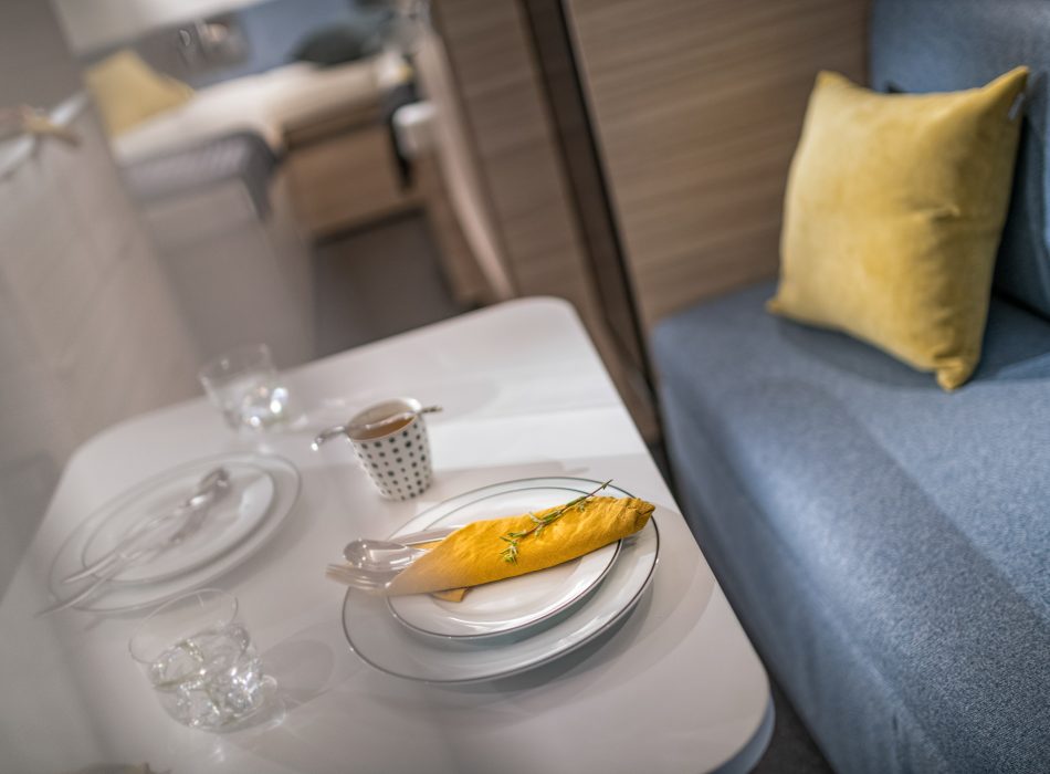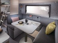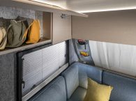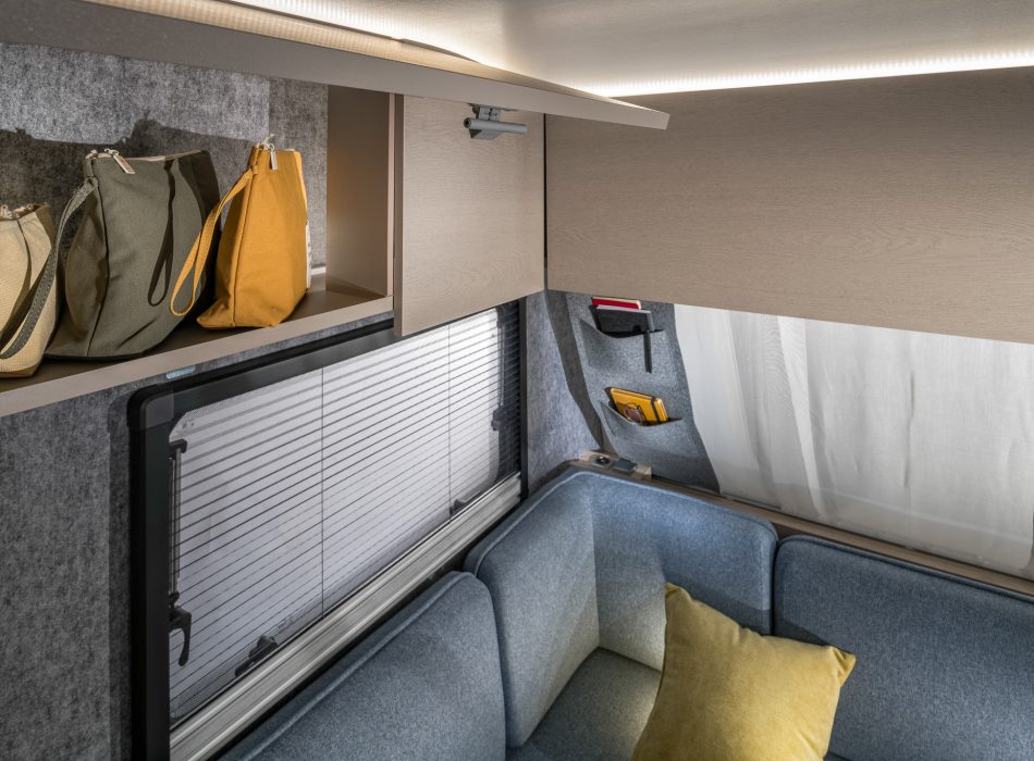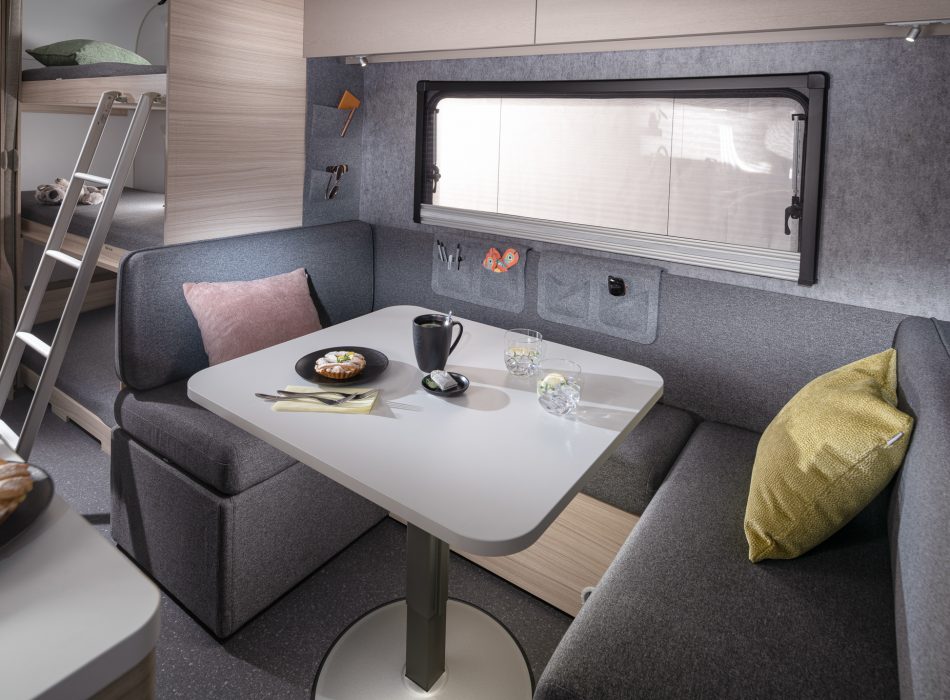 Niet alleen de carrosserie van de Adria Altea 2023 is lichter. Voor de kasten is bijvoorbeeld ook gebruikgemaakt van een lichtgewicht constructie. Bovendien zijn in de wandkasten uitneembare planken aanwezig. De u-vormige dinette is comfortabel en heeft een lichter frame. Bovendien is hij makkelijk om te bouwen tot extra slaapplaatsen door middel van metalen haken. Voor de bekleding heb je de keuze uit drie moderne kleuren. Desgewenst met contrasterende sierkussens.