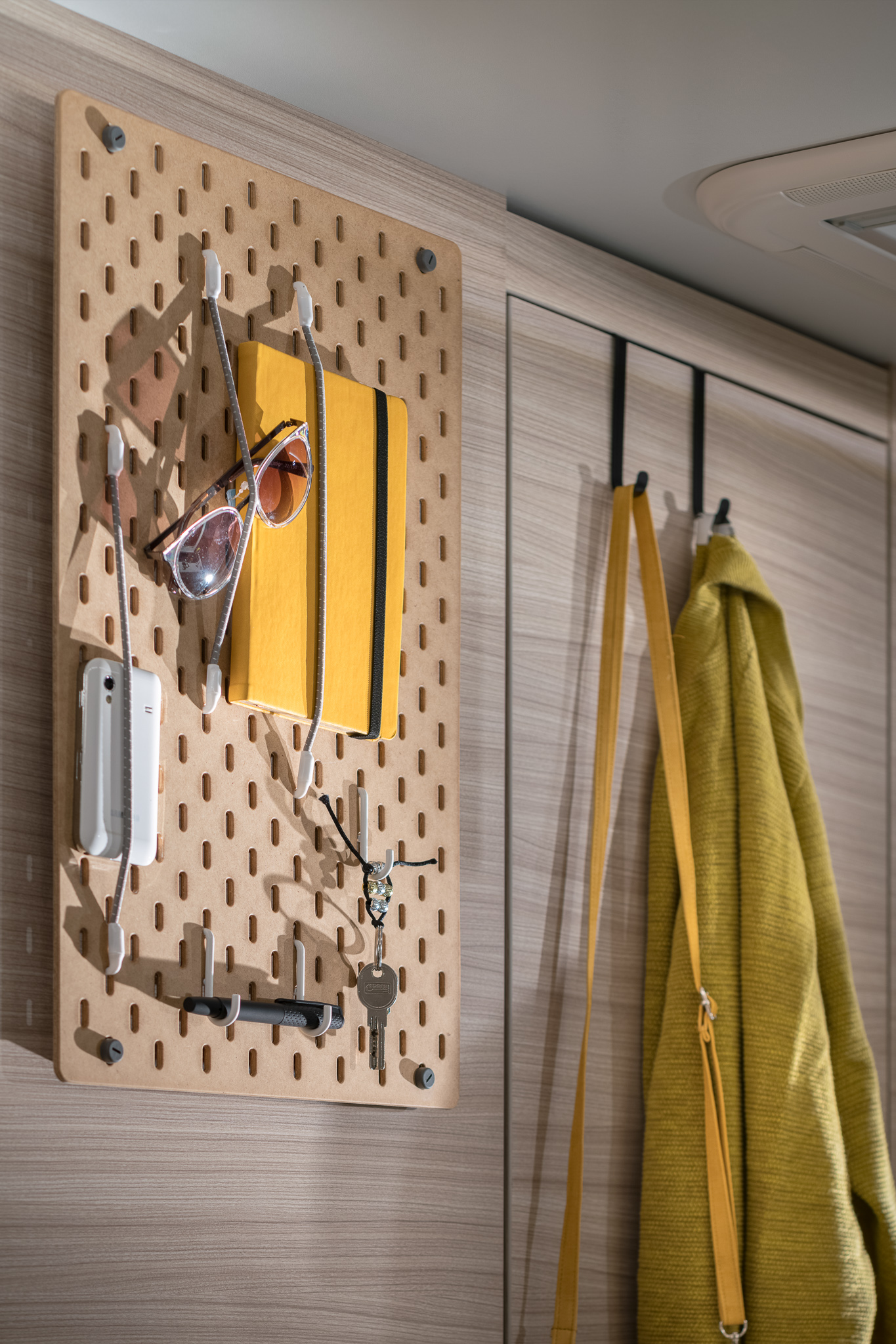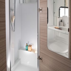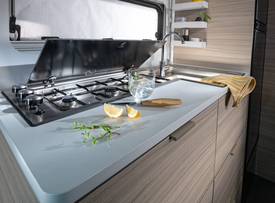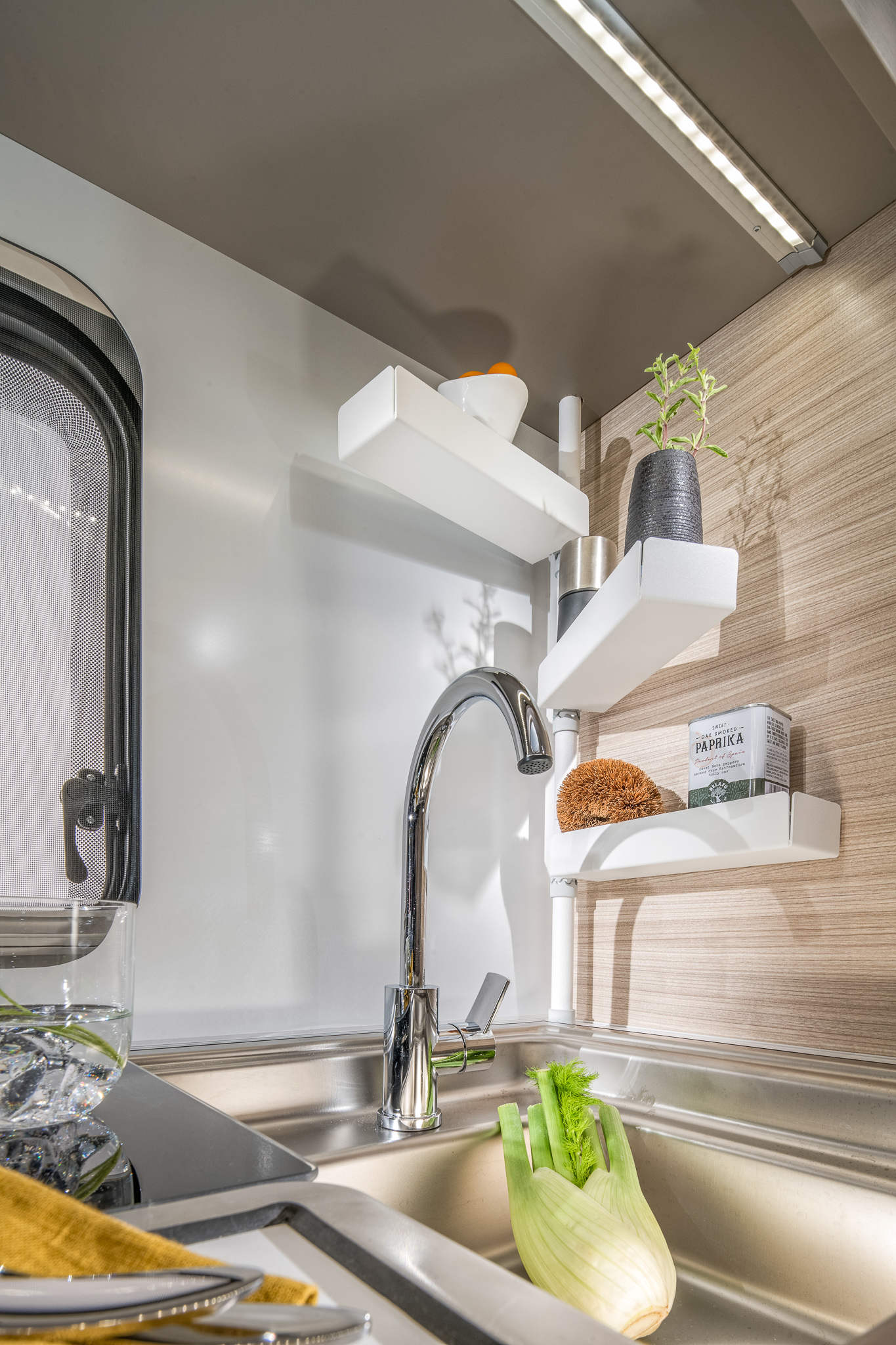 De Adria Altea 2023 is niet alleen lichter, maar ook functioneler. Zo is er veel aandacht besteed aan de opbergruimte. In de keuken is dit terug te zien aan het formaat van de lades en de verwijderbare opbergplanken. De wastafel in de badkamer is opklapbaar, waardoor er goed gebruik wordt gemaakt van de ruimte. In de slaapkamer en bij de zithoek hangen vilten tassen om kleinere spullen in op te bergen, en ook aan de voorkant van de caravan zien we een ruime opbergruimte.