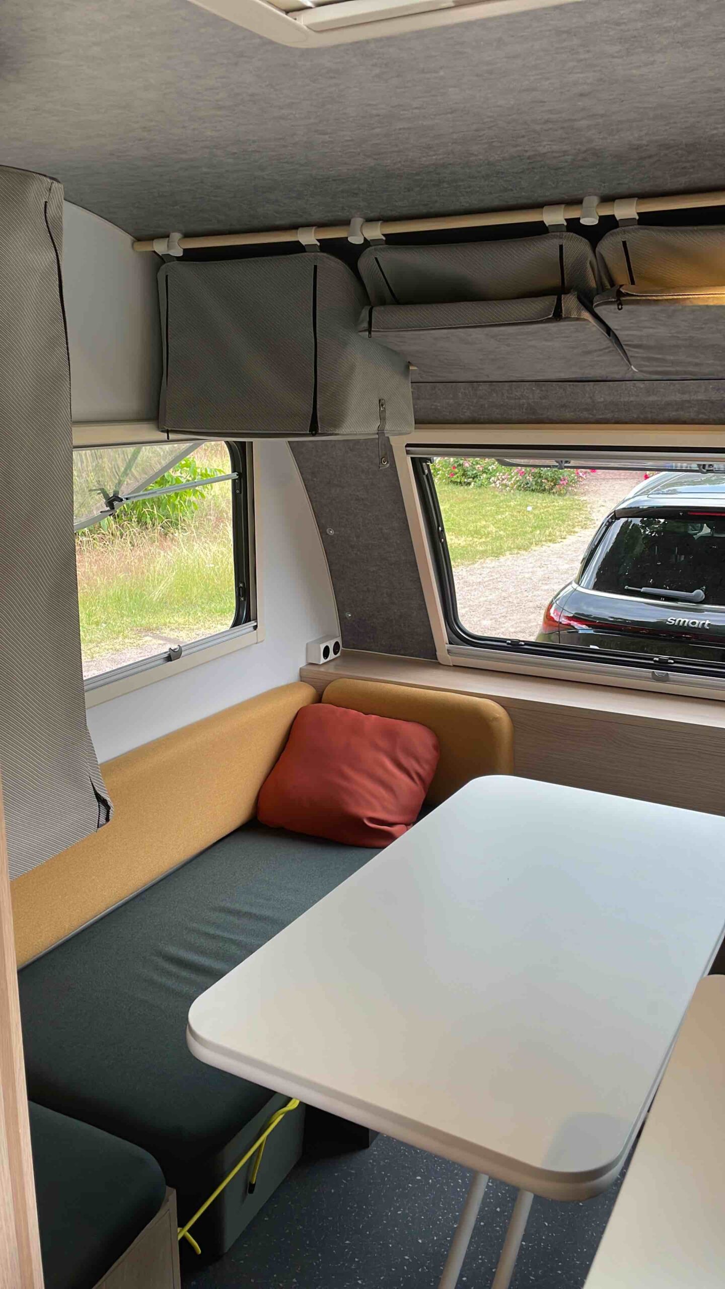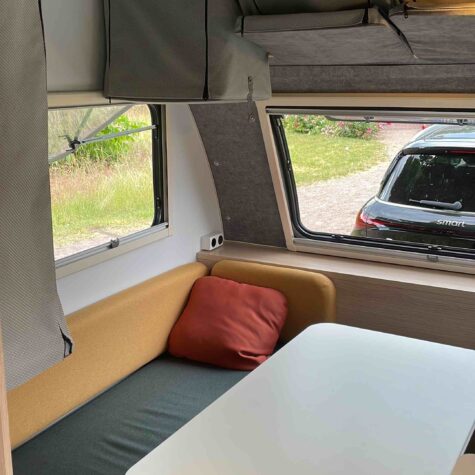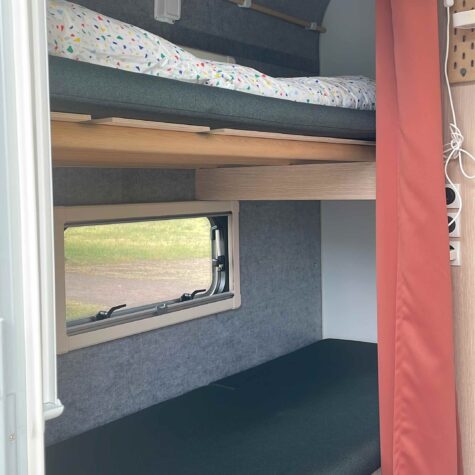 Adria noemt de nieuwe Aviva Lite ‘cool en funky’. Wij vinden hem vooral licht en flexibel. De caravan komt in eerste instantie in de 360 DK-indeling. Deze heeft stapelbedden achterin en een zithoek die je om kunt bouwen tot tweepersoonsbed.