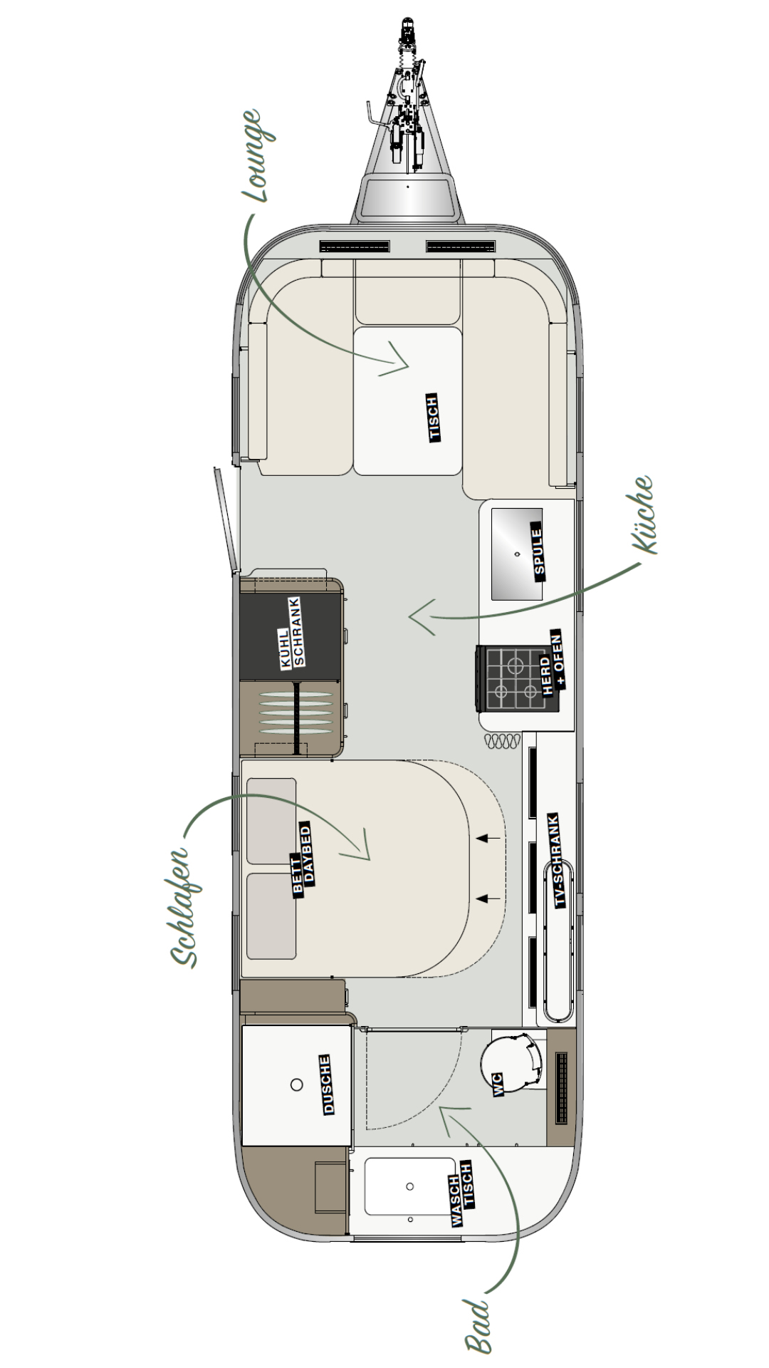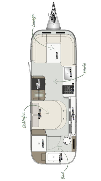 In de boeg is een ronde zithoek geplaatst waar je met zes personen kunt zitten en die eventueel om te bouwen is tot een bed van 1,45×2,18 meter. Dat brengt het aantal slaapplaatsen in de Airstream International 25IB op vier.