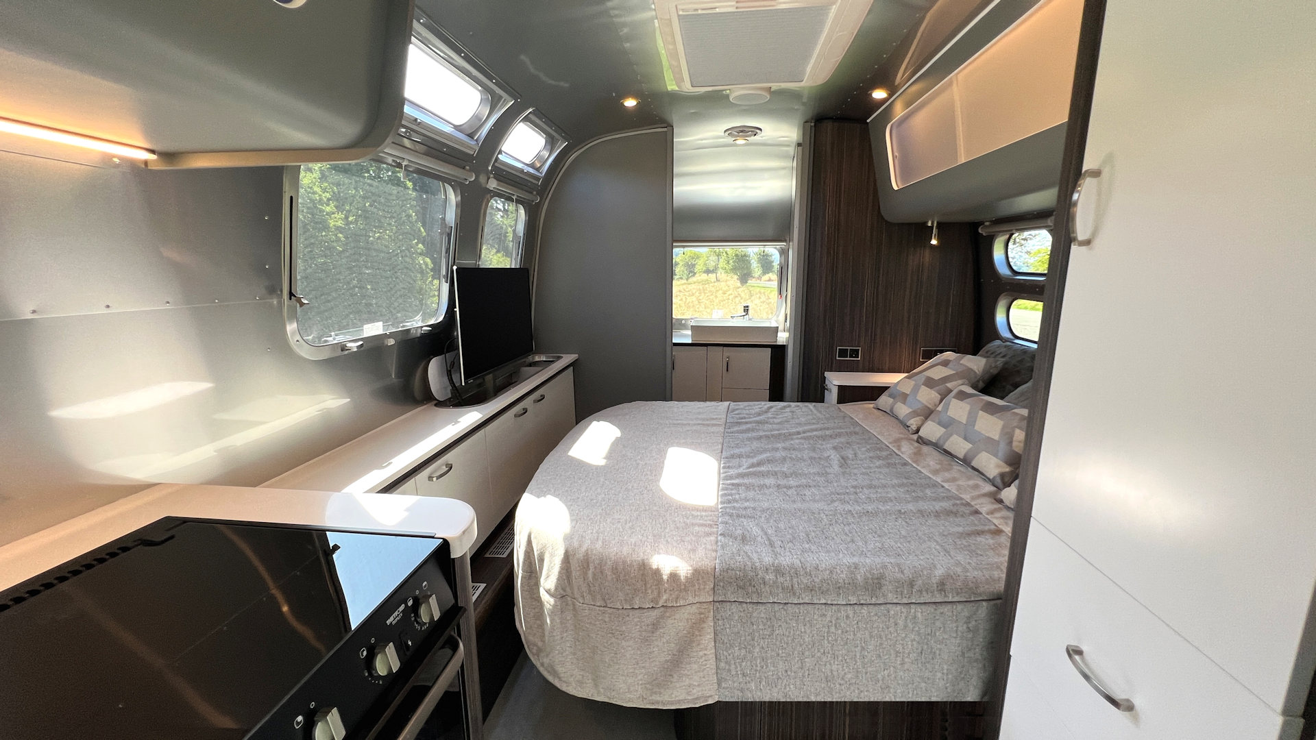 De Airstream International 25IB heeft een woonoppervlakte van bijna zeventien vierkante meter. Opgesloten zul je je dus niet snel voelen. Het interieur oogt modern door de donkere houten meubels met witte fronten en de grijze bovenkasten. De blikvanger in de caravan is echter het tweepersoonsbed. Van de afmeting van 1,42×1,83 zijn we niet zo onder de indruk, maar dat het dwars op de rijrichting is geplaatst en van beide kanten goed bereikbaar is, is mooi meegenomen. Bovendien is het bed met één druk op de knop in te korten, waardoor je overdag meer bewegingsruimte hebt.