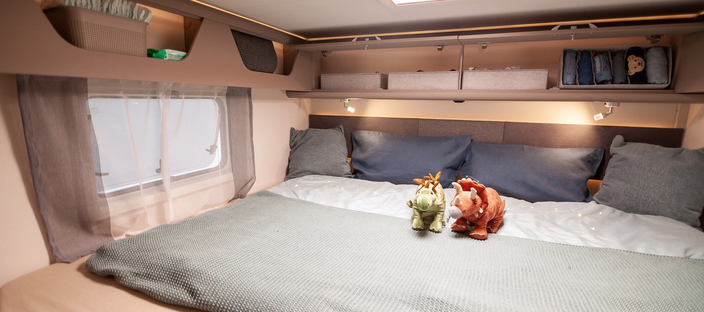 Carado-campers hebben veel opbergruimte in de slaapkamer, maar hoe benut je die nu optimaal? Een organizer is de oplossing, zo laat Isabella Franke zien in deze YouTube-video. De kleine vakjes zijn ideaal voor het opbergen van sokken, ondergoed en kleine accessoires als riemen. Deze organizers passen goed in de bovenkasten van de camper. Voor het opbergen van kledingstukken en schoenen in de grote kasten raadt Franke stapelbare dozen aan. En wil je kleding ophangen? Doe dit dan aan dunne fluwelen kledinghangers. Ze zijn licht en smal en de kleding glijdt er minder snel af tijdens het rijden.
